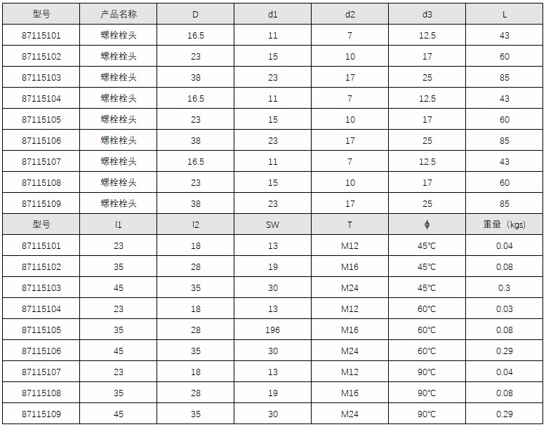 订货号 制造商型号 总长度 适配拉钉 D d1 d2 d3 l1 l2 SW T ɸ 重量(kgs) 价格 购物车