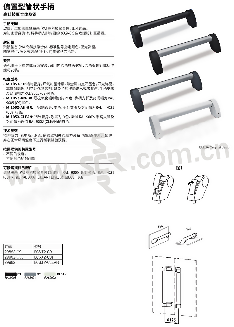 ·手柄支脚:玻璃纤维加固聚酰胺基(PA)高科技聚合体,亚光饰面;为防止管身旋转,将手柄支脚内设的 ø3,9x6,5 自攻螺钉拧至最紧·封闭帽:聚酰胺基(PA)高科技聚合体,标准型号指定颜色,亚光饰面;·M.1053-EP: 铝制管身,环氧树脂涂层,带金属白点石墨色,亚光饰面。高度耐磨损、刮花及化学溶剂。避免持续接触沸水或者蒸汽。手柄支脚及封闭帽为RAL 9005 (C9)黑色·M.1053-AN-BK: 阳极氧化铝制管身,本色,手柄支脚及封闭帽为RAL 9005 (C9)黑色