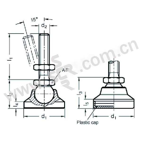 ·底座5.8级镀锌钢(抗拉强度为500N/mm2),蓝钝处理。 - OS型:无塑料底盘。 - KS型:带天然白色热塑性塑料底盘(聚甲醛基POM),可滑动。- KR型:带由硬度为肖氏73的热塑性橡胶制成的底盘 (SANTOPRENE),不可滑动。- KSE型:带天然白色热塑性塑料底盘(聚甲醛基POM),可滑动, 可导电(抗静电)。- KRE型:带由硬度为肖氏73的热塑性橡胶制成的底盘 (SANTOPRENE),不可滑动, 可导电(抗静电)。