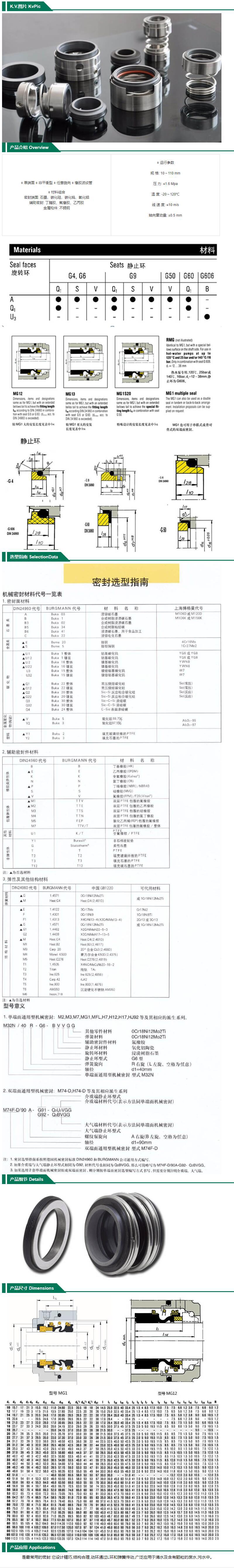 ·单端面、非平衡型、任意旋向、橡胶波纹管 ·材料组合 ·密封端面:石墨、碳化硅、碳化钨、氧化铝 ·辅助密封:丁腈胶、氟橡胶、乙丙胶 ·金属构件:不锈钢 ·运行参数 ·规格:10~110mm ·压力:≤1.6Mpa ·温度:-20~120℃ ·线速度:≤10m/s ·轴向窜动量:±0.5mm