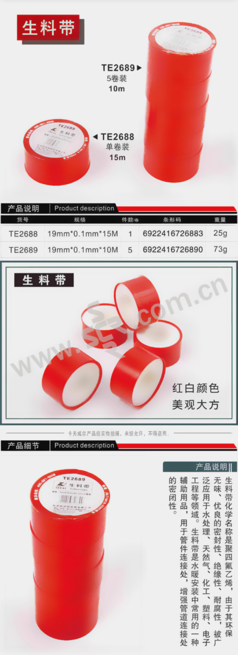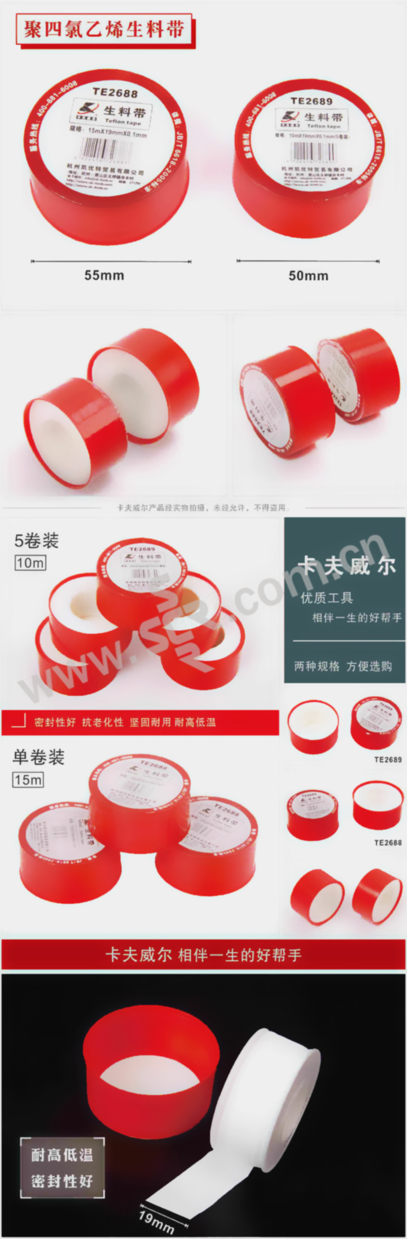 OK-TOOLS/卡夫威尔 生料带 TE2689 10m 5卷 1筒
