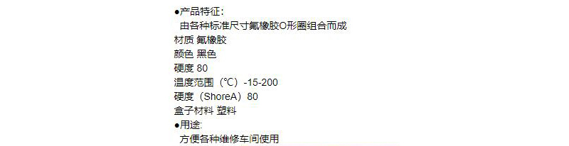 ·由各种标准尺寸氟橡胶O形圈组合而成 ·材质 氟橡胶 ·颜色 黑色 ·硬度 80 ·温度范围(℃)-15~200 ·硬度(ShoreA)80 ·盒子材料 塑料