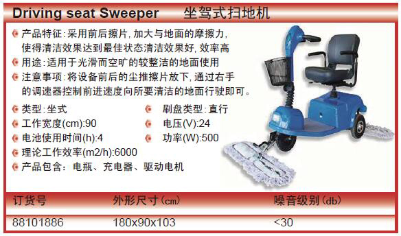 ·采用前后擦片,加大与地面的摩擦力, ·使得清洁效果达到最佳状态清洁效果好,效率高 ·注意事项:将设备前后的尘推擦片放下,通过右手 的调速器控制前进速度向所要清洁的地面行驶即可。 ·类型:坐式 刷盘类型:直行 ·工作宽度(cm):90 电压(V):24 ·电池使用时间(h):4 功率(W):500 ·理论工作效率(m2/h):6000 ·产品包含:电瓶、充电器、驱动电机