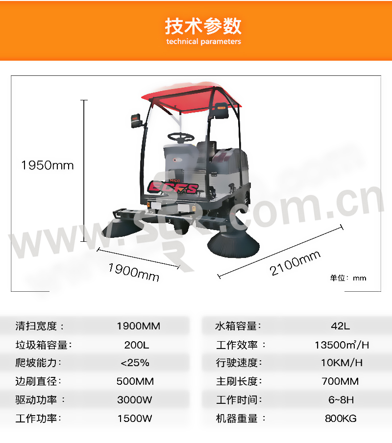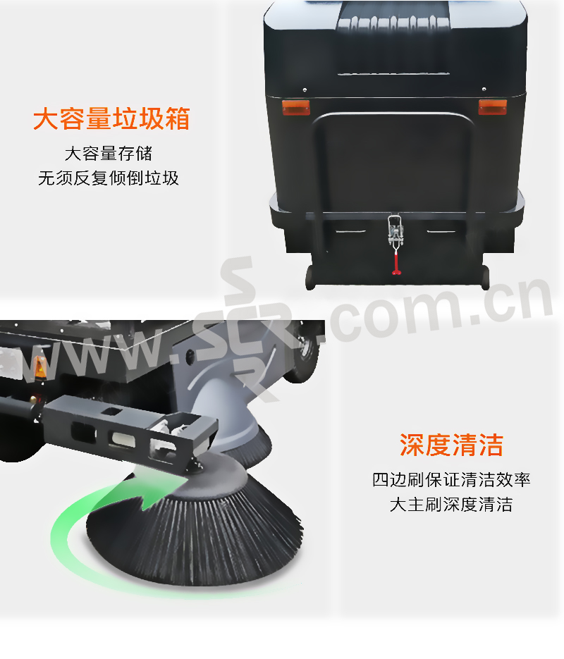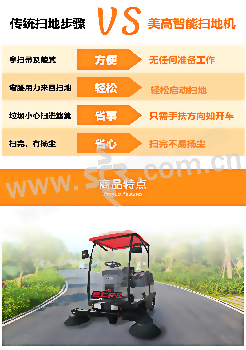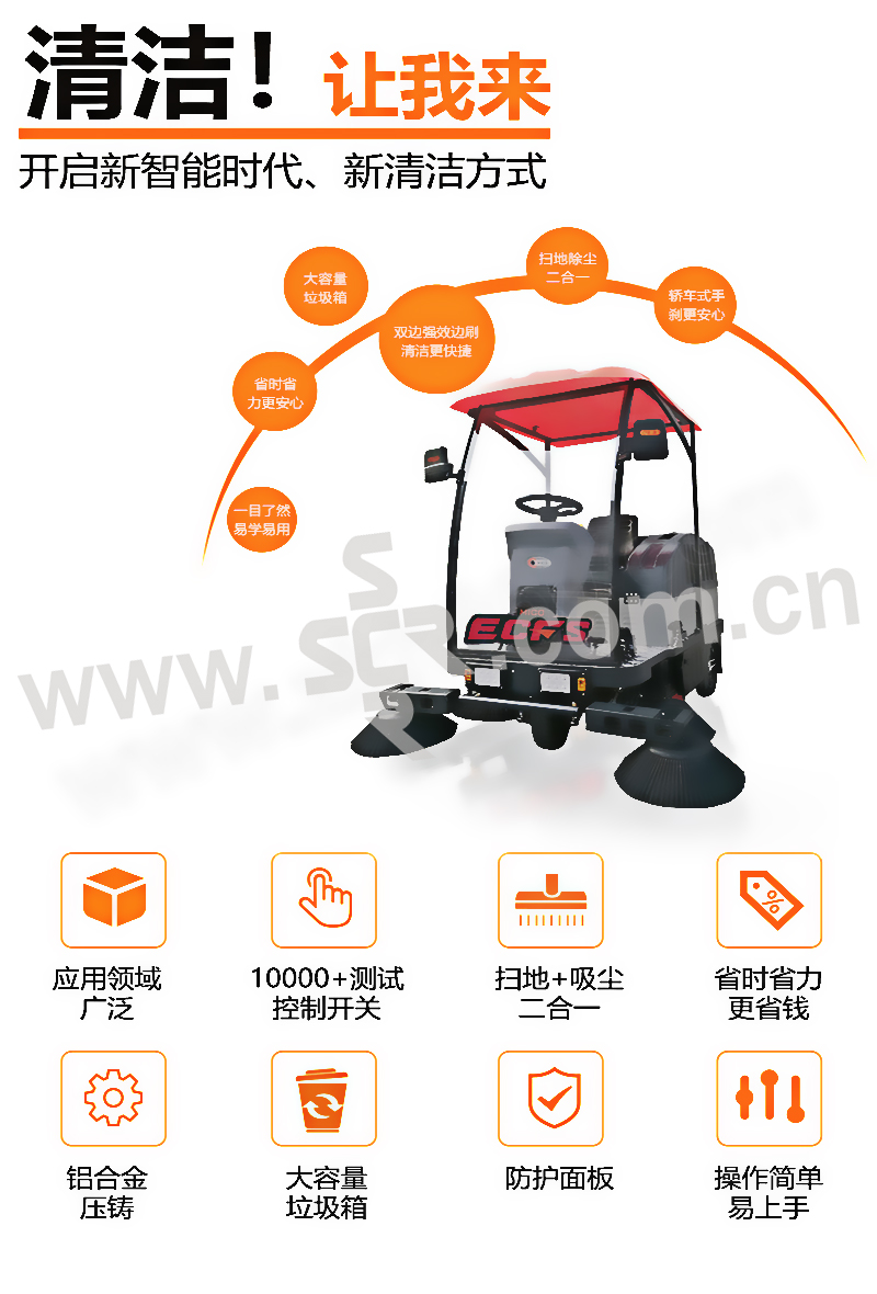 ·开放式带挡风玻璃设计,操作视野更宽阔舒适.·简易化控制面版设计,操作更简便,易学易会。·手刹与脚刹双重制动设计,全面满足您的安全行车需求。·自动喷水装置,避免清扫过程尘土飞扬。·高底座设计与特制震系统,任意走过各种减速带。·整体车身为烤漆板金结构,坚同经久耐用。