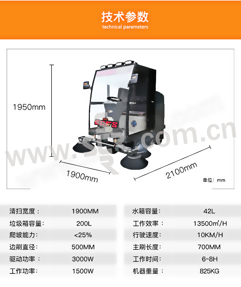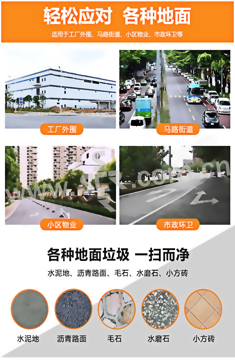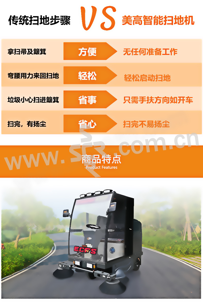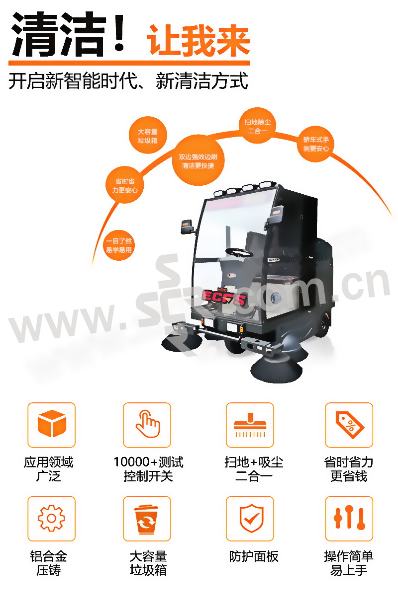 ·简易化控制面版设计操作更简便易学易会·手刹与脚刹双重制动设计,全面满足您的安全行车需求·配备实心轮胎,防止轮胎扎钉,影响日常正常使用·自动喷水装置,避免清扫过程土飞扬。·高底座设计与特制减震系统,任意走过各种减速带。·整体车身为烤漆板金结构,坚固经久耐用·灵活变速配置,满足不同场所清扫需求,提高工作效率。·清扫效果干净彻底,轻松清扫数叶、烟头果皮、尘土、矿泉水瓶、