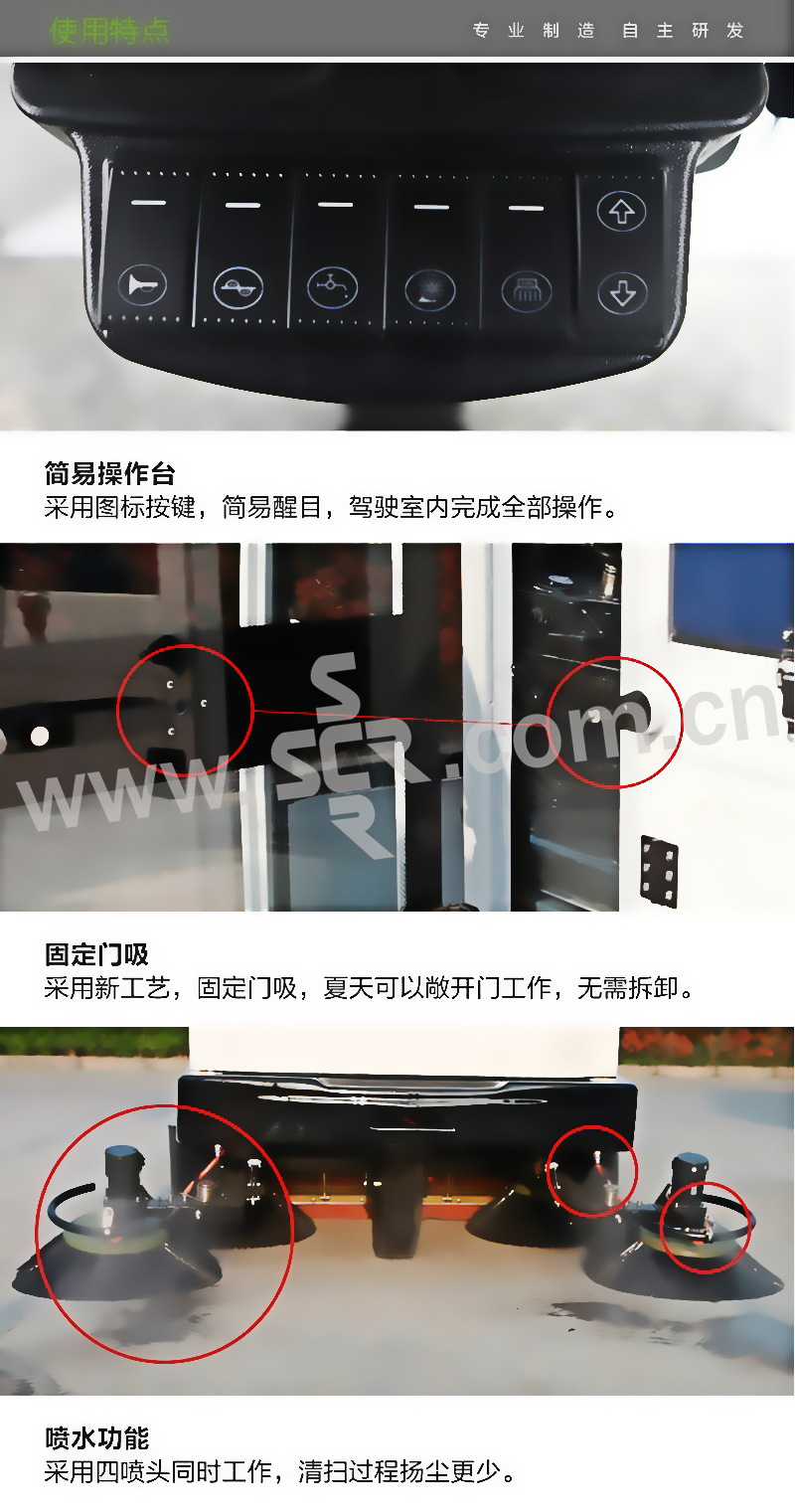 ·采用国类首创先进三轮清扫车超大过滤系统,过滤面积更大,吸尘能力更强。·水箱容量为100L,是三轮电动扫地车中最大的水箱容量。·采用全封闭驾驶室,避免天气、噪音等恶劣条件对清扫工作的影响。双开门,装有防撞锁,侧门可后折固定,夏天通风凉爽,冬天防寒保暖。·人性化的设计理念为使用者提供安全舒适的操作环境。·采用48V免维护蓄电池为动力,节能环保,连续使用时间更长。·扫地机线束符合TS16949标准,供电可靠,关键连接器全部阻燃防水。·扫地系统的核心电