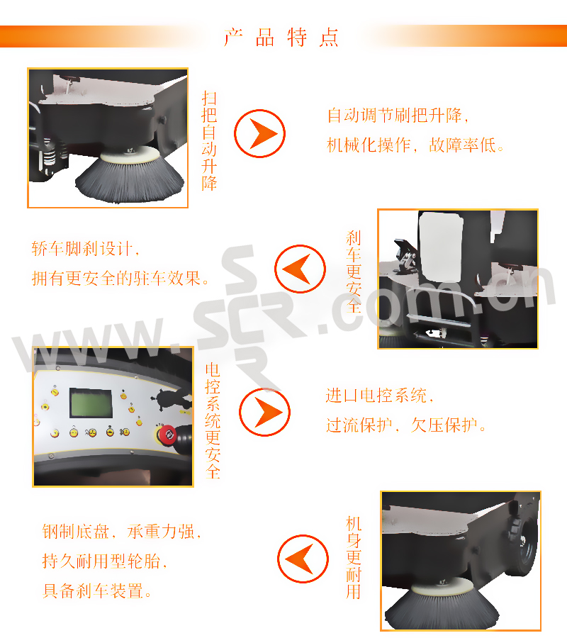 ·简洁的中控台设计,操控更方便·舒适的座椅设计,良好的操控视野·轿车型手刹设计,为您提供更安全的驻车效果·根据地面高低感应调节,主刷、边刷自动升降,更智能,更可靠·高底盘通过性更强,清扫宽度1400mm·外壳美观实用,采用ABS工程环保塑料棚·进口欧美电控系统,集约式设计安装,过流保护,欠压保护·190L超大垃圾箱,提高清洁效果效率