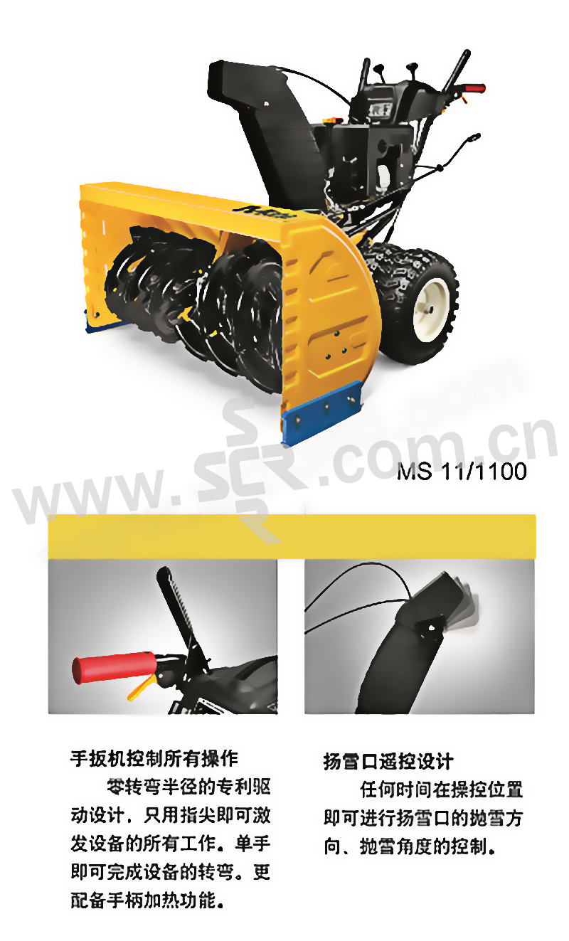 ·耐高冲击力扬雪口;内置前灯;燃油位指示;扳机式动力方向盘;单手控制;不锈钢雪铲;防锈、防滑滑撬;重型钢材螺旋铰轮;自驱动导向轮;可延伸加油管;交叉式轮胎