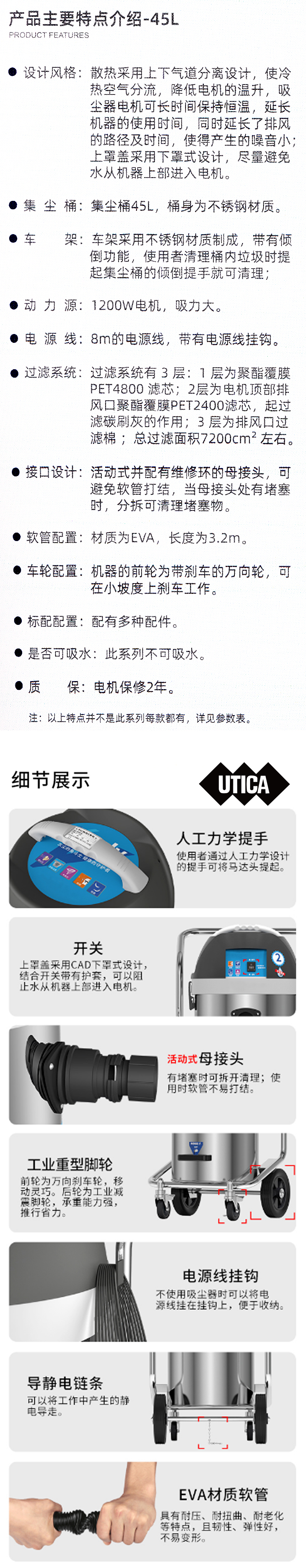 J16035 MT40-401-938 1200W 8M的电源线 集尘桶20/32L,桶身为PP材质注塑而成,桶内无螺丝,光滑易清理。 机器的前轮为万向轮,在移动时轻巧灵活方便 纸袋、布袋、可推车架(1232)配有多种配件 电源线8米+软管3.2米+调风手柄0.3米+金属伸缩管1.2米+吸尘刷0.2米约等于12.7米*2 7305.16