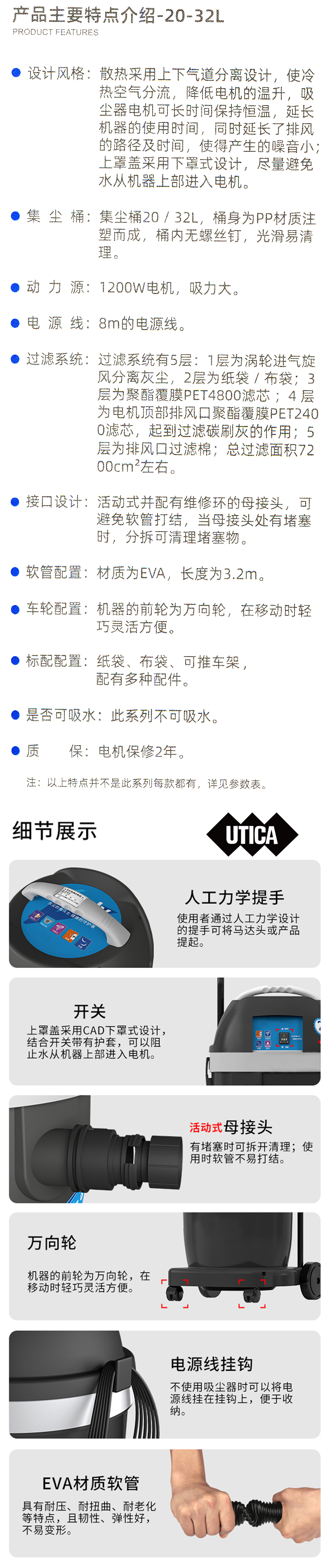 J16035 MT40-401-938 1200W 8M的电源线 集尘桶20/32L,桶身为PP材质注塑而成,桶内无螺丝,光滑易清理。 机器的前轮为万向轮,在移动时轻巧灵活方便 纸袋、布袋、可推车架(1232)配有多种配件 电源线8米+软管3.2米+调风手柄0.3米+金属伸缩管1.2米+吸尘刷0.2米约等于12.7米*2 7305.16