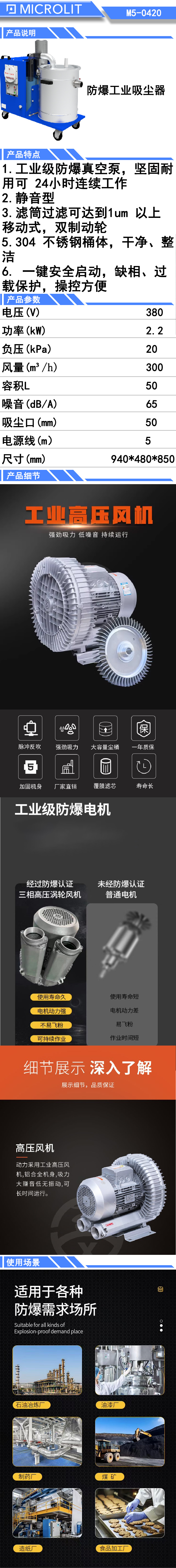 * 工业级防爆真空泵,坚固耐用可24小时连续工作 * 静音型 * 滤筒过滤可达到1um以上 * 移动式,双制动轮 * 304不锈钢桶体,干净、整洁 * 一键安全启动,缺相、过载保护,操控方便