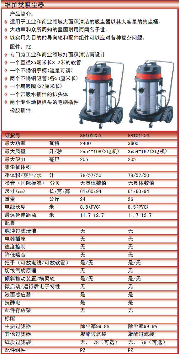 订货号 制造商型号 电压 功率 最大风量 最大吸力 噪音 尺寸 重量 电线长度 最远延申距离 脉冲过滤清洁 电器插座 速度控制 降低噪音 把手(可放电线/可放软管) 切线气旋原理 倾斜推动装置/横梁轮 微启动/运行后电子特性 液面感应器 抗静电 配件存放架 价格 购物车