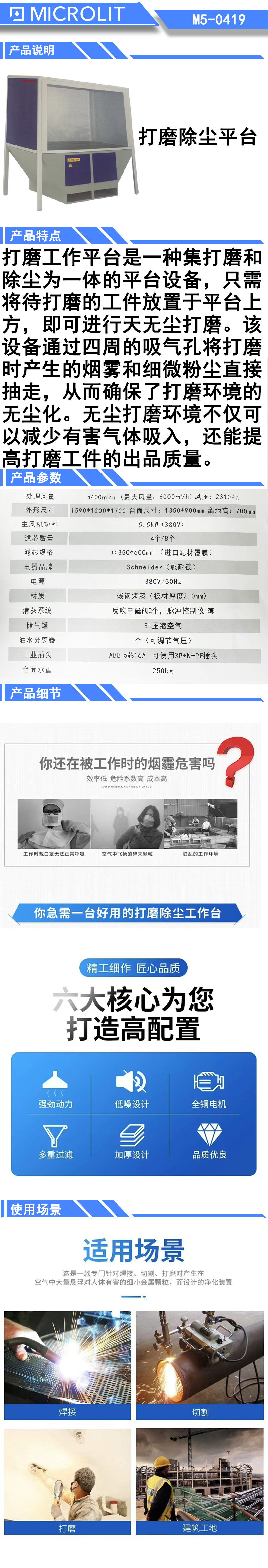 * 打磨工作平台是一种集打磨和除尘为一体的平台设备,只需将待打磨的工件放置于平台上方,即可进行无尘打磨。 * 该设备通过四周的吸气孔将打磨时产生的烟雾和细微粉尘直接抽走,从而确保了打磨环境的无尘化。 * 无尘打磨环境不仅可以减少有害气体吸入,还能提高打磨工件的出品质量。