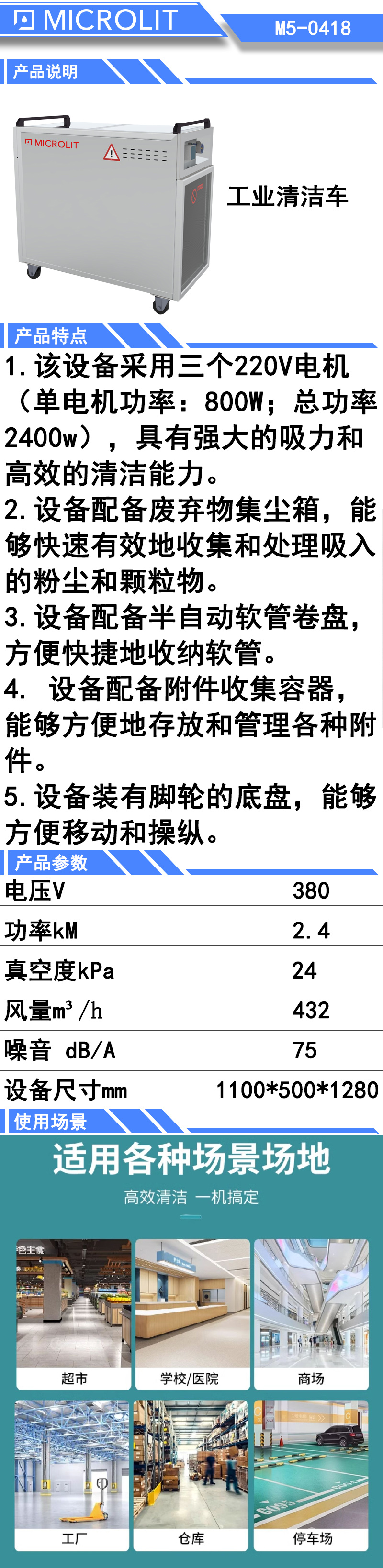 * 该设备采用三个220V电机(单电机功率:800W;总功率2400w),具有强大的吸力和高效的清洁能力。 * 设备配备废弃物集尘箱,能够快速有效地收集和处理吸入的粉尘和颗粒物。 * 设备配备半自动软管卷盘,方便快捷地收纳软管。 * 设备配备附件收集容器,能够方便地存放和管理各种附件。 * 设备装有脚轮的底盘,能够方便移动和操纵。