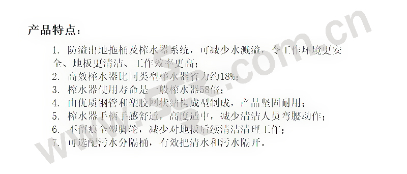 ·防溢出地拖桶及榨水器系统,可减少水溅溢,令工作环境更安全、地板更清洁、工作效率更高