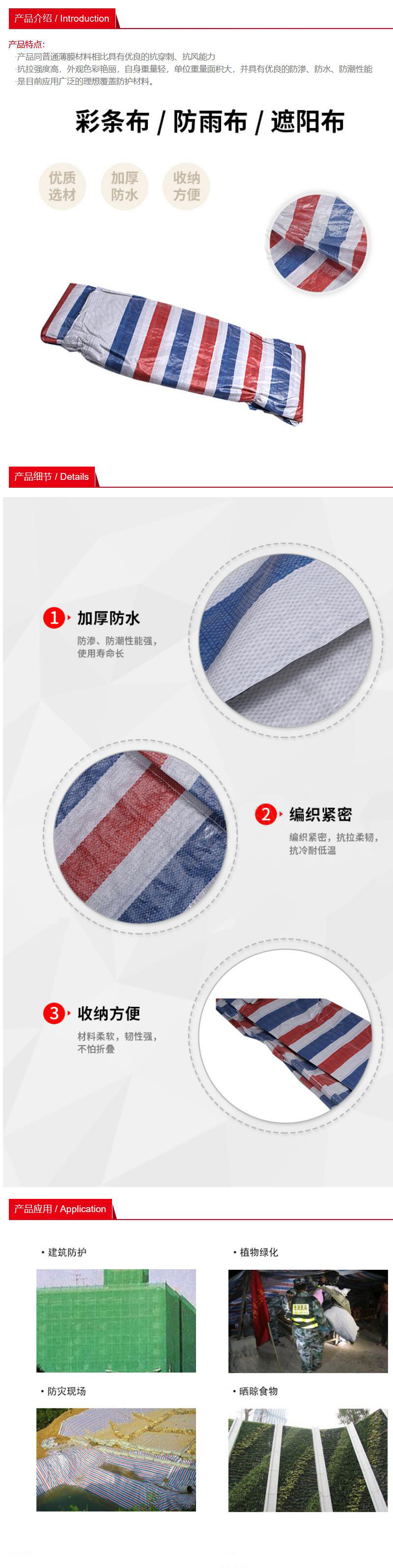 ·产品同普通薄膜材料相比具有优良的抗穿刺、抗风能力 ·抗拉强度高,外观色彩艳丽,自身重量轻,单位重量面积大,并具有优良的防渗、防水、防潮性能 ·是目前应用广泛的理想覆盖防护材料