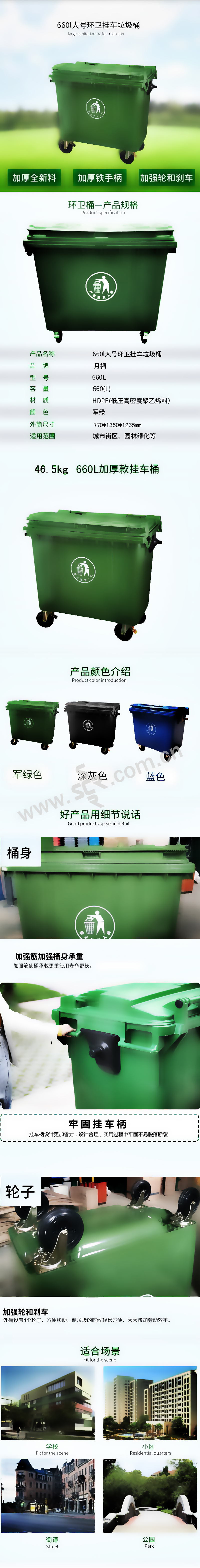 ·桶身配备加厚挂车柄,自带舒适把手,配置实心轮,带2个刹车轮