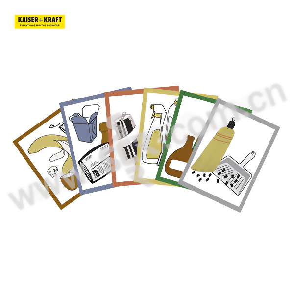 ·六色标签,用于标识可降解垃圾、玻璃、纸张、垃圾、塑料和金属
