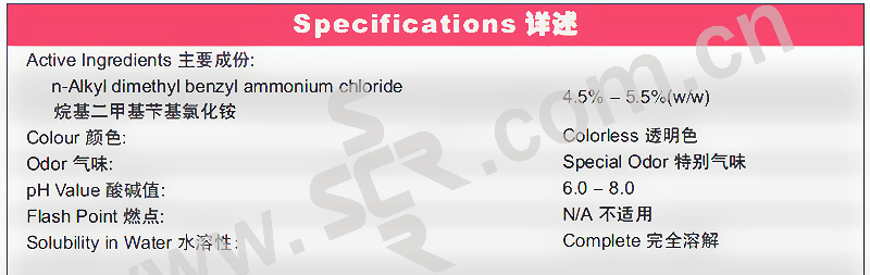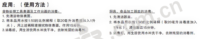·本品是以烷基二甲基苄基氯化铵为主要有效成分的消毒液,烷基二甲基苄基氯化铵含量为4.5%-5.5%,可以有效杀灭肠道致病菌和化脓性球菌。强效消毒,经济耐用,有利环保和健康。广泛应用于:食品处理工具表面、工作台面、厨具及食品加工设备、器皿、地面、墙面等日常消毒。