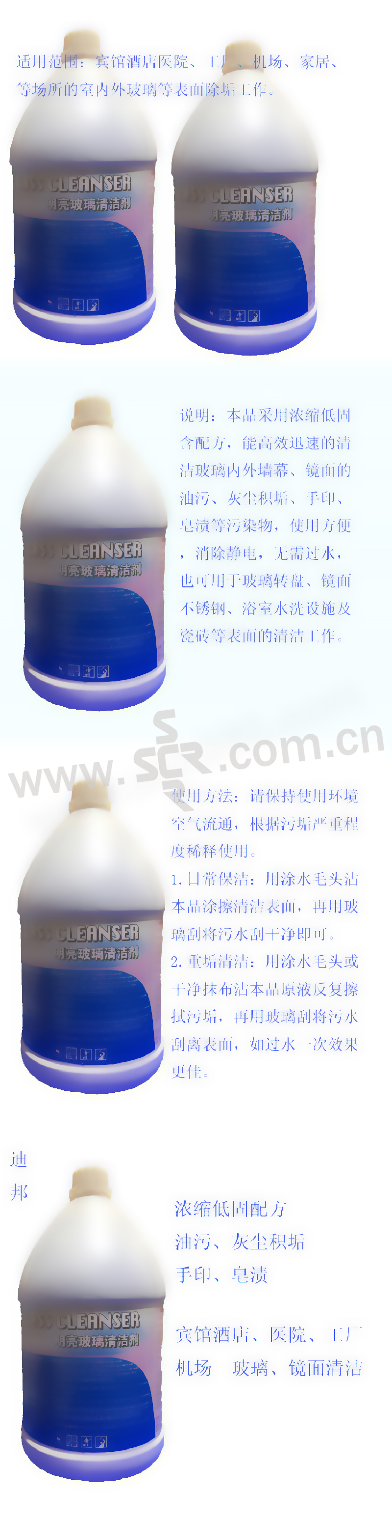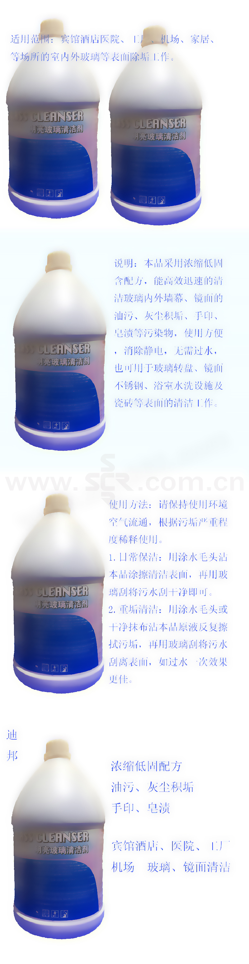 ·采用浓缩低固含配方,能高效迅速地清洁玻璃内外墙幕、镜面的油污、灰尘积垢、手印、皂渍等污染物,使用方便,消除静电,无需过水,亦可用于玻璃转盘、镜面不锈钢、浴间水洗设施或磁砖等表面的日常清洁工作。