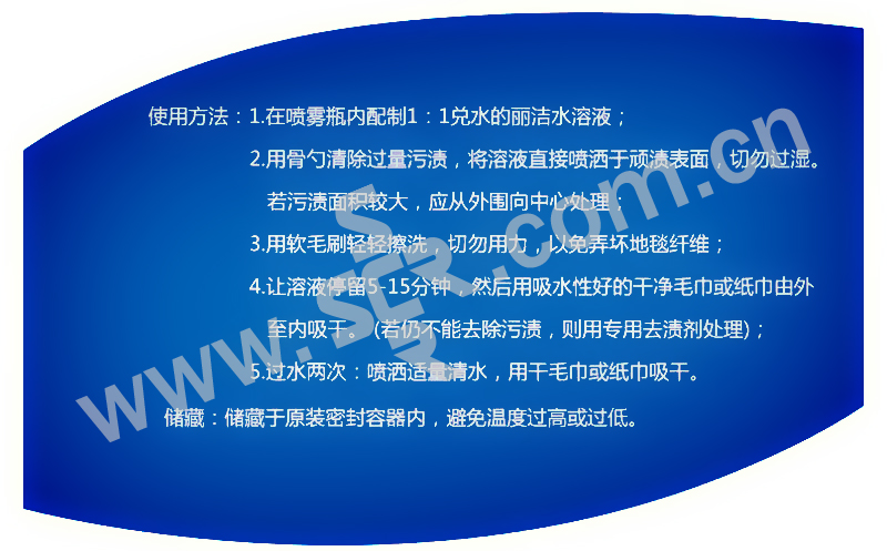 ·含特殊的表面活性剂,配合地毯抽洗机使用,清洁力强,同时还在每根地毯纤维上形成聚合体保护膜,令日后清洁护理更加容易.适用于羊毛和合成纤维地毯。适用场所:各类高档商场、宾馆、餐饮娱乐、写字楼宇及学校医院等大型公共场所,更可在自己家庭内使用。