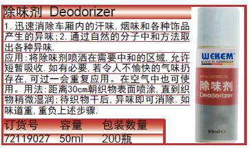·迅速消除车厢内的汗味,烟味和各种饰品产生的异味; ·通过自然的分子中和方法取出各种异味. ·应用:将除味剂喷洒在需要中和的区域,允许短暂吸收.如有必要,若令人不愉快的气味扔存在,可过一会重复应用。在空气中也可使用。 ·用法:距离30cm朝织物表面喷涂,直到织物稍微湿润;待织物干后,异味即可消除.如味道重,重负上述步骤.