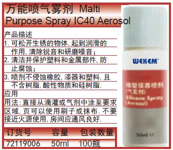 ·产品描述 ·可松开生锈的物体,起到润滑的作用,清除锐音和研磨噪音; ·清洁并保护塑料和金属部件,防止腐蚀; ·喷剂不侵蚀橡胶,漆器和塑料,且不含树脂,酸性物质和硅树脂. ·应用用法:直接从滴灌或气剂中涂至要求区域,页可以使用刷子或抹布.不要接近火源使用,房间应通风良好.