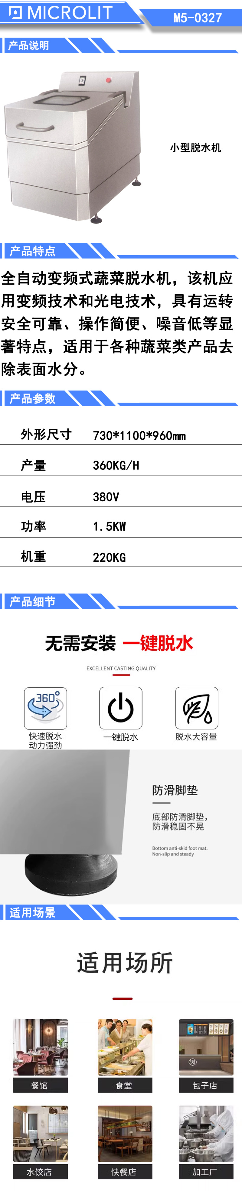 * 全自动变频式蔬菜脱水机,该机应用变频技术和光电技术,具有运转安全可靠、操作简便、噪音低等显著特点。