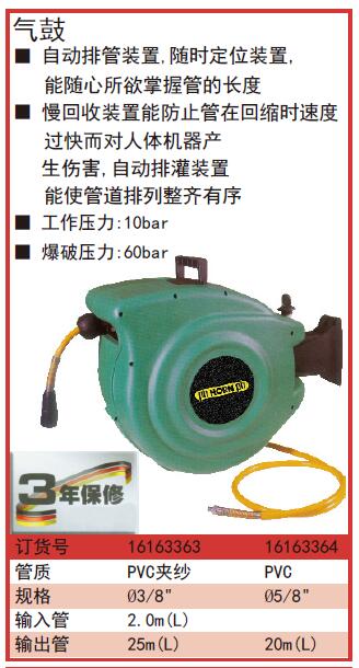 ·自动排管装置,随时定位装置,能随心所欲掌握管的长度 ·慢回收装置能防止管在回缩时速度过快而对人体机器产生伤害,自动排灌装置能使管道排列整齐有序 ·工作压力:10bar ·爆破压力:60bar
