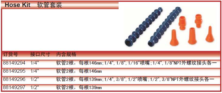 软管2根,每根139mm;1/4",3/8",1/2"喷嘴;1/2",3/8"NPT外螺纹接头各一
