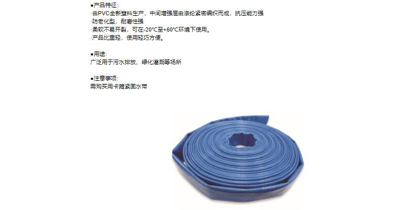 ·由PVC全新塑料生产,中间增强层由涤纶紧密编织而成,抗压能力强 ·防老化型,耐磨性强 ·柔软不易开裂,可在-20℃至+60℃环境下使用。 ·产品比重轻,使用轻巧方便。