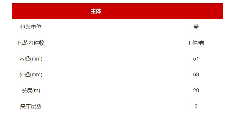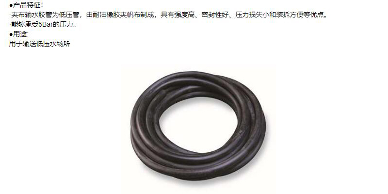 ·夹布输水胶管为低压管,由耐油橡胶夹帆布制成,具有强度高、密封性好、压力损失小和装拆方便等优点。 ·能够承受5Bar的压力。
