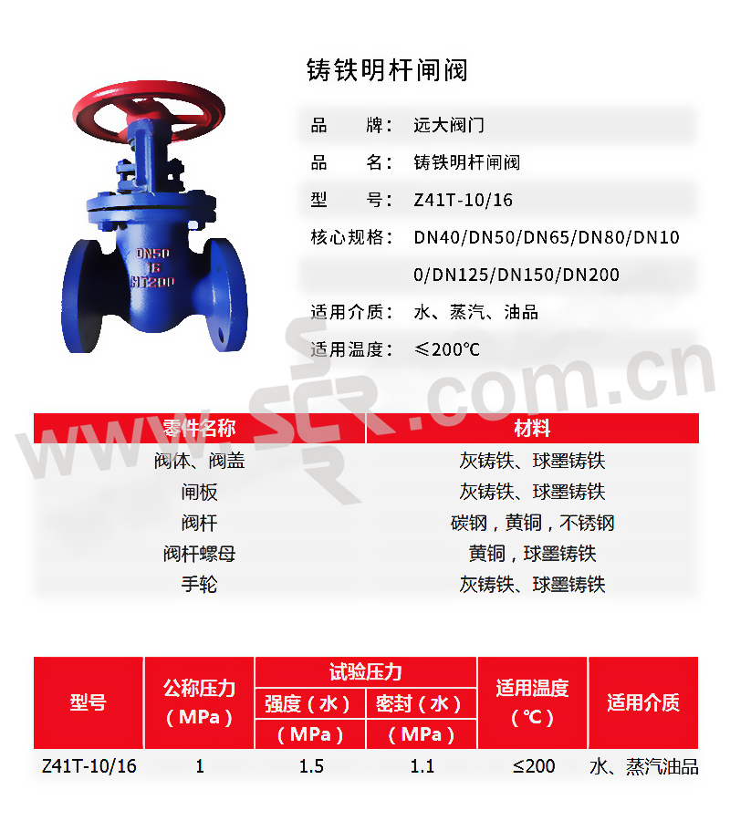 ·工作原理:安装在闸板上的阀杆螺母通过阀杆的旋转来带动闸板升降,阀杆自身不做升降运动·流体阻力小