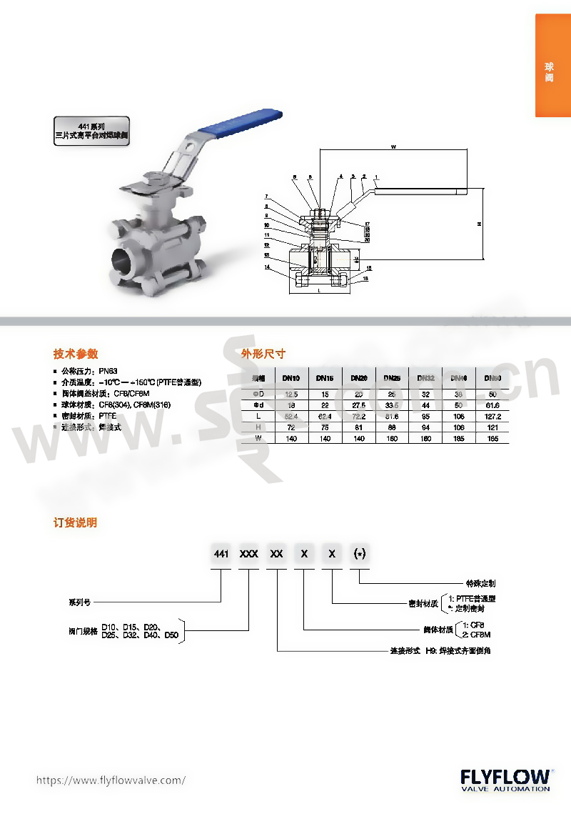 FLYFLOW/福莱福流 441系列三片式高平台对焊球阀 441D10H911 DN10 CF8不锈钢阀体 公称压力16bar 1个