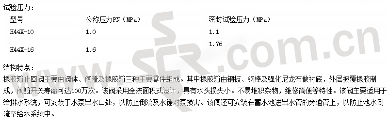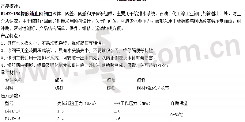 ·H44X-16Q橡胶瓣止回阀由阀体、阀盖及橡胶瓣三种首要零件组成。橡胶瓣止回阀其间橡胶瓣由钢板、钢棒及强化尼龙布做衬底,外层披覆橡胶制成,阀瓣开关寿数可达100万次。橡胶瓣止回阀选用全流面积式规划,具有水头丢失小,不易堆积杂物,修理简洁等特性。