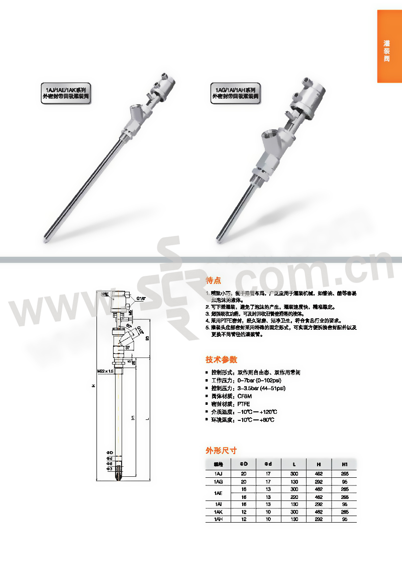 ·精致小巧,便于排管布局,广泛应用于灌装机械,如酱油、醋等容易起泡沫的液体。·可下潜灌装,避免了泡沫的产生,灌装速度快,精准稳定。·强吸收功能,可及时回收沿管壁滑落的液体。·采用PTFE密封,经久耐磨、洁净卫生,符合食品行业的要求。·灌装头底部密封采用特殊的固定形式,可实现方便拆换密封配件以及更换不同管径的灌装管。