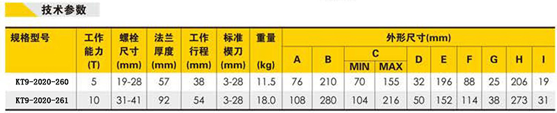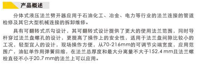 ·具有可翻转式爪勾设计,其可翻转式设计提供了更大的使用法兰范围,同时导杆穿过法兰盘螺孔的设计,更提高了操作上的安全性,适用于法兰盘间隙比较小的工况,轻型宜人的设计,现场操作方便,从70-216mm的可调节尖端宽度,应用范围广,油缸单作用弹簧回缩,在法兰总厚度和最大分离量不大于152.4 mm且法兰螺栓直径不小于20.7 mm的法兰上可以应用。