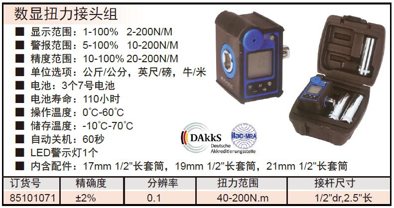 ·显示范围:1-100% 2-200N/M ·警报范围:5-100% 10-200N/M ·精度范围:10-100% 20-200N/M ·单位选项:公斤/公分,英尺/磅,牛/米 ·电池:3个7号电池 ·电池寿命:110小时 ·操作温度:0℃-60℃ ·储存温度:-10℃-70℃ ·自动关机:60秒 ·LED警示灯1个 ·内含配件:17mm 1/2"长套筒,19mm 1/2"长套筒,21mm 1/2"长套筒