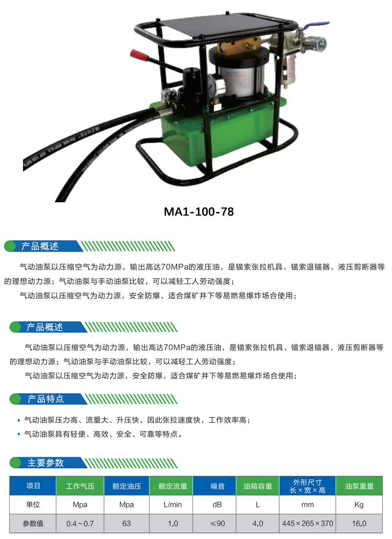 ·气动油泵压力高、流量大、升压快,因此张拉速度快,工作效率高;气动油泵具有轻便、高效、安全、可靠等特点。