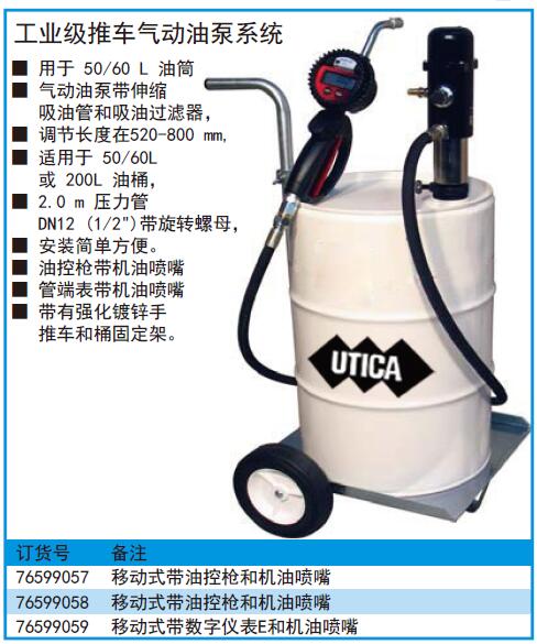 ·用于 50/60 L 油筒 ·气动油泵带伸缩吸油管和吸油过滤器, ·调节长度在520-800 mm, ·适用于 50/60L或 200L 油桶, ·2.0 m 压力管 DN12 (1/2")带旋转螺母, ·安装简单方便。 ·油控枪带机油喷嘴 ·管端表带机油喷嘴 ·带有强化镀锌手推车和桶固定架。