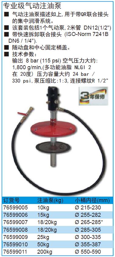 ·气动注油泵描述如上,用于带QR联合接头的集中润滑系统。