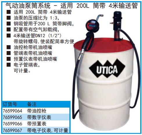 ·适用200L筒带4米输送管 ·油泵的压缩比为1:3, ·钢吸管用于200L筒带脚阀, ·配置带有空气卸载阀, ·4米输送管DN12(1/2")带旋转螺母,使装配简单方便 ·油控枪带机油喷嘴 ·管端表带机油喷嘴 ·预置仪表带机油喷嘴 ·电子管端表,可计量。