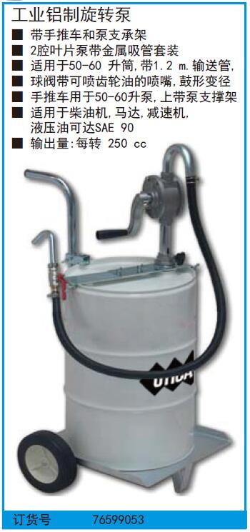 ·带手推车和泵支承架 ·2腔叶片泵带金属吸管套装 ·适用于50-60升筒,带1.2m.输送管, ·球阀带可喷齿轮油的喷嘴,鼓形变径 ·手推车用于50-60升泵,上带泵支撑架 ·适用于柴油机,马达,减速机,液压油可达SAE90 ·输出量:每转250cc