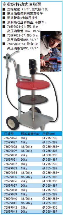 ·专业级移动式油脂泵 ·连接螺纹R1/4",空气操作泵 ·高压油脂控制阀带直转环 ·硬质管带4卡液压接头 ·油脂随动盘和桶盖,手推车。 ·76599026-31:带3.5m高压油脂管DN6,R1/4" ·76599032-37:带6.5m高压油脂管DN6,R1/4" ·76599038-43:带有10m高压油脂管DN6,R1/4"