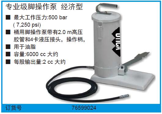 ·最大工作压力:500bar(7,250psi) ·桶用脚操作泵带有2.0m高压胶管和4卡液压接头,操作柄, ·用于油脂 ·容量:6000cc大约 ·每股输出量:2cc大约