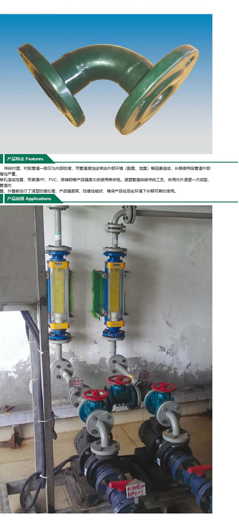 ·浸塑管道是以金属管件为基材,通过独特配方,采用先进的浸塑工艺,利用专用塑料在管件内外表面制作成各种钢塑复合管道,解决了防腐领域的一大难题。 ·是一种集多种防腐耐磨优点于一体的环保工程产品,是替代传统衬胶、衬塑、 ·玻璃钢等即经济又实用的产品。