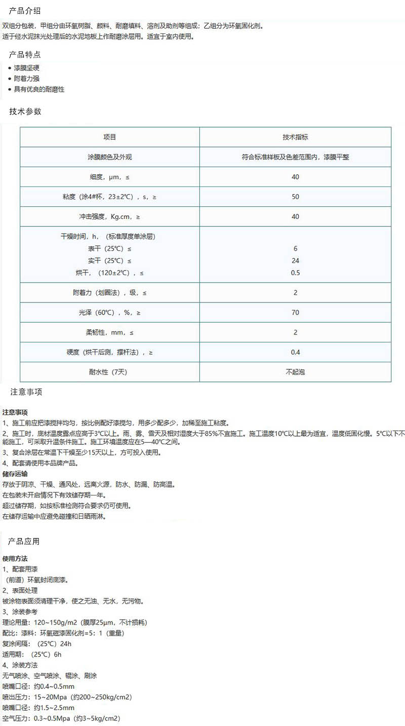 ·双组分包装,甲组分由环氧树脂、颜料、耐磨填料、溶剂及助剂等组成;乙组分为环氧固化剂。