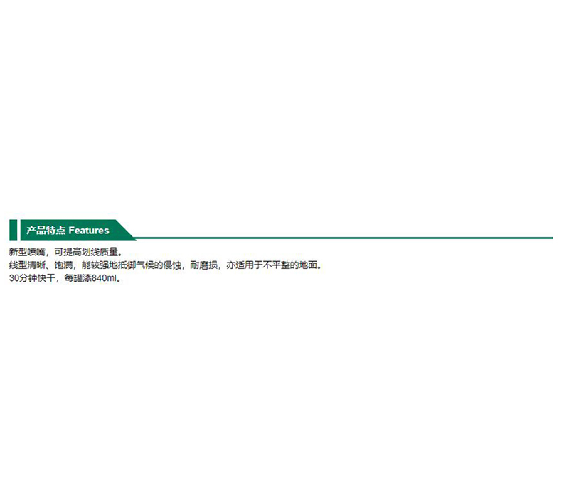 ·新型喷嘴,可提高划线质量。 ·线型清晰、饱满,能较强地抵御气候的侵蚀,耐磨损,亦适用于不平整的地面。 ·30分钟快干,每罐漆840ml。