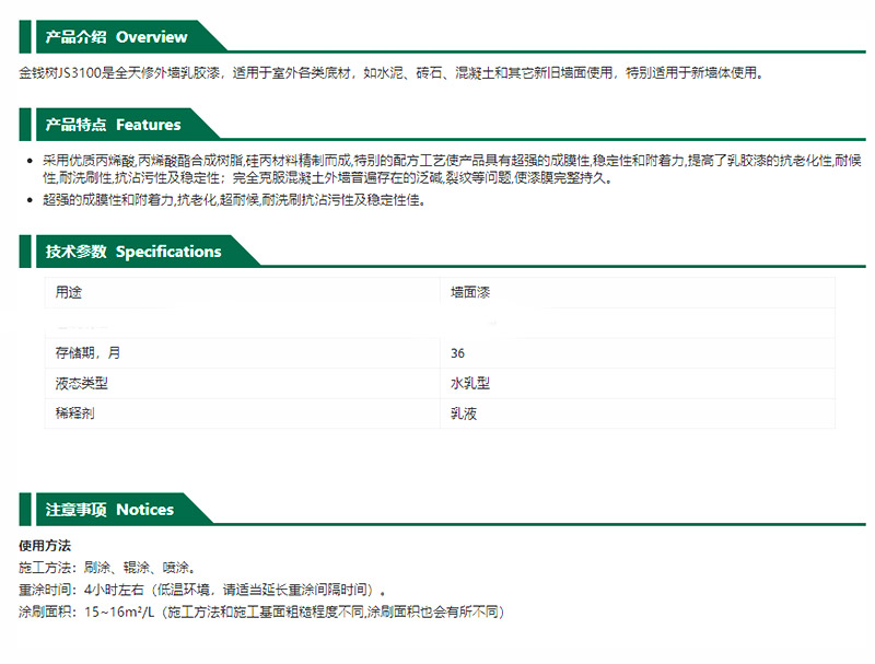 ·超强的成膜性和附着力,抗老化,超耐候,耐洗刷抗沾污性及稳定性佳。