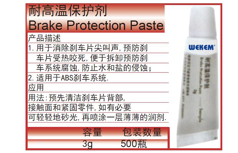 ·产品描述 ·用于消除刹车片尖叫声,预防刹车片受热咬死,便于拆卸预防刹车系统腐蚀,防止水和盐的侵蚀; ·适用于ABS刹车系统. ·应用 ·用法:预先清洁刹车片背部,接触面和紧固零件,如有必要可轻轻地砂光,再喷涂一层薄薄的润剂
